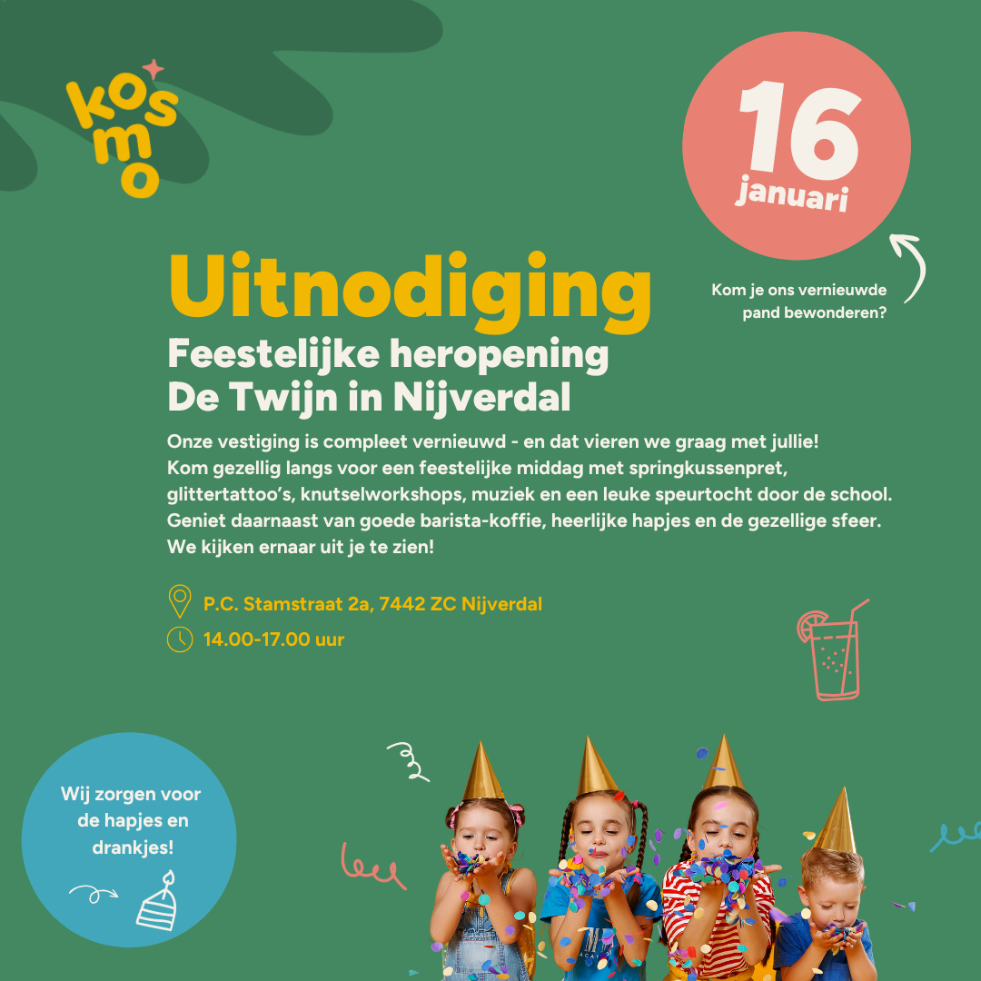 15 december 2025Bij onze vestiging De Twijn in Nijverdal starten we 2026 extra feestelijk. Na een periode van hard werken heeft De Twijn een volledig vernieuwd interieur gekregen. En wat zijn we trots op het eindresultaat. KOSMO De Twijn is mooier dan ooit! Nieuwsgierig? Kom naar onze heropening op vrijdag 16 januari van 14.00 tot 17.00 uur.
